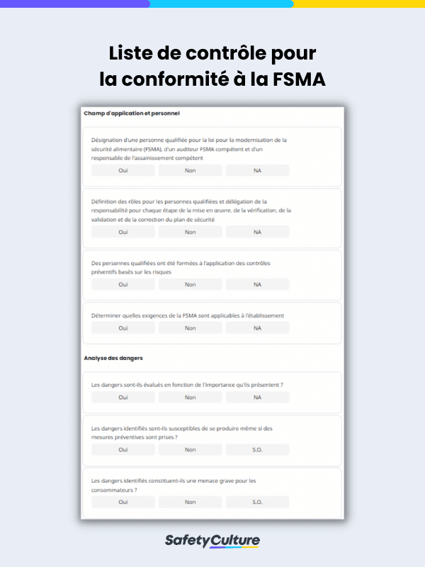 Une liste de contrôle de conformité à la FSMA est un outil de contrôle principalement utilisé dans l’industrie agricole pour se conformer à la loi américaine de 2011 sur le contrôle de la sécurité alimentaire, en particulier pour la règle 1 ou l’élaboration et la mise en œuvre de contrôles préventifs. Les listes de contrôle de conformité à la FSMA précisent généralement le champ d’application et le personnel (par exemple, la désignation d’un auditeur et d’un responsable de l’assainissement compétents) et comprennent l’analyse des risques alimentaires (biologiques, dans l’établissement ou dans la chaîne d’approvisionnement), la validation et la vérification des contrôles préventifs et la réanalyse du programme complet de sécurité alimentaire établi.