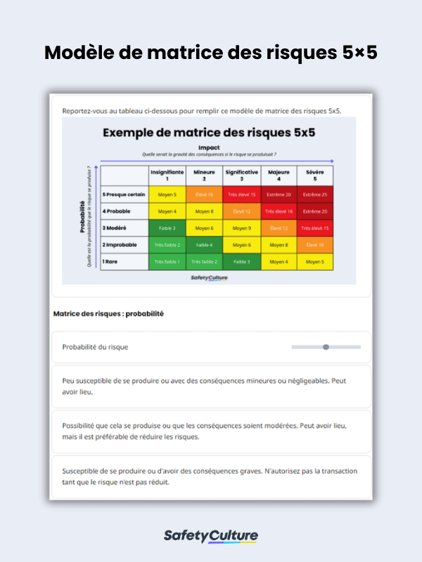 Un modèle de matrice des risques 5×5 est un outil utilisé pour mesurer les niveaux de risque en fonction de leur probabilité et de leur impact sur une organisation. Il présente les informations sur les risques à l’aide d’une matrice tabulaire à code couleur avec un système d’échelle numérique étendu. Cette visualisation approfondie permet aux responsables de la santé et de la sécurité (SST) et aux chefs de projet d’adopter une approche plus granulaire pour calculer les risques et élaborer des stratégies d’intervention appropriées.
