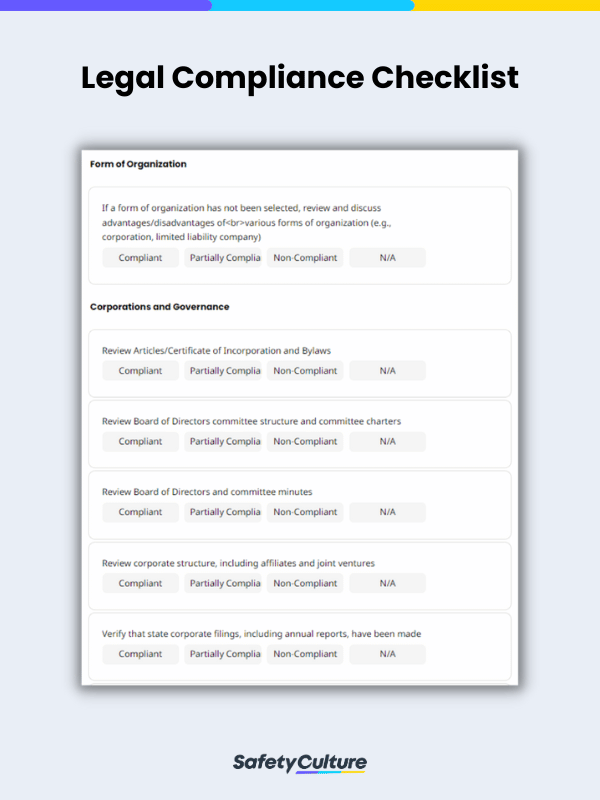 Dans de nombreux cas, le respect des réglementations légales nécessite de nombreuses inspections, de la documentation et de la paperasserie, d’où la nécessité d’une liste de contrôle de la conformité légale. Une liste de contrôle de la conformité légale permet de normaliser les processus afin de s’assurer que tous les travailleurs sont sur la même longueur d’onde, et d’aider les inspecteurs, les gestionnaires et les dirigeants à effectuer des audits légaux. Le non-respect des lois et des règlements peut entraîner des amendes, la fermeture d’entreprises, etc.