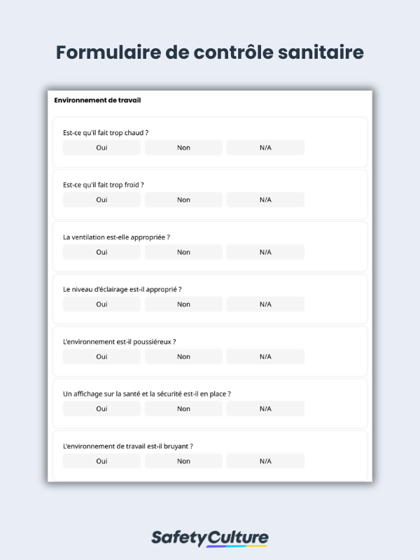 Un formulaire de santé et de sécurité est un outil utilisé pour renforcer les pratiques de santé et de sécurité au travail (SST) et aider les organisations à se conformer aux règles de sécurité et aux réglementations. La réalisation de contrôles réguliers à l’aide de formulaires de santé et de sécurité constitue une approche proactive de la prévention des incidents, des blessures et des maladies liés au travail.