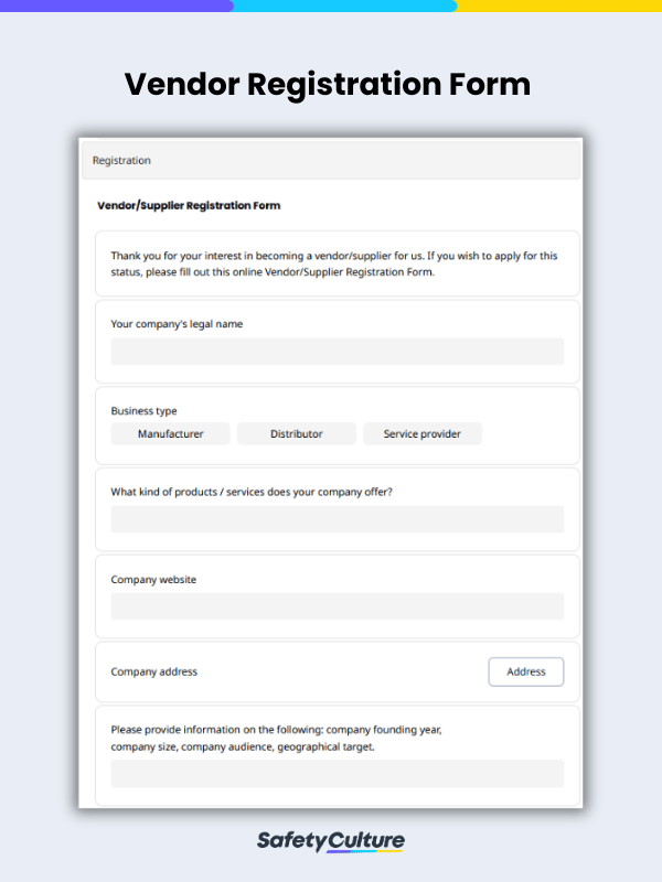 Formulaire d’inscription des vendeurs Les organisateurs de festivals, de congrès et d’événements similaires utilisent les formulaires de prospection pour sélectionner les fournisseurs potentiels. Le modèle exact peut varier, mais en général, un formulaire de prospection fournisseur enregistre des données telles que le nom et l’adresse de l’entreprise du vendeur, le nom et les coordonnées de la personne à contacter, ainsi que les produits et services qu’elle propose, entre autres.