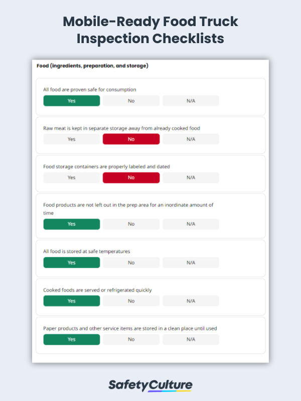 Une liste de contrôle pour l’inspection des food trucks est un outil qui aide les propriétaires de food trucks à s’assurer que leurs activités sont conformes aux normes établies en matière de sécurité et d’hygiène alimentaires, de stockage, de tenue des lieux et d’entretien des food trucks. La réalisation d’inspections régulières à l’aide d’une checklist pour l’homologation des food trucks permet au personnel de rester vigilant en cas d’inspections sanitaires surprises de la part des autorités locales, de faire fonctionner votre entreprise à plein régime et, surtout, de protéger vos clients contre les risques sanitaires liés aux maladies d’origine alimentaire.