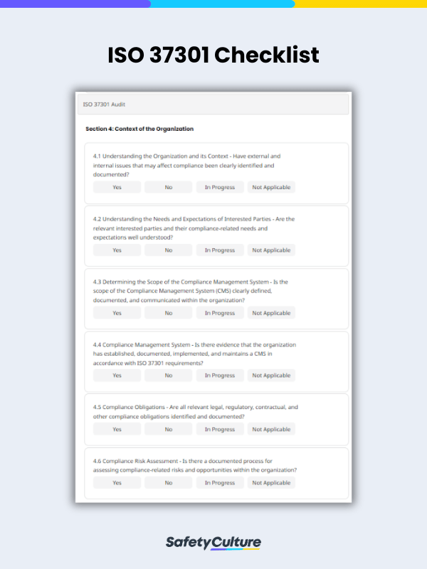 Découvrez les éléments clés à inclure et à utiliser dans une liste de vérification ISO 37301 à l’aide de cet exemple pratique. Vous pouvez également l’utiliser comme guide pour évaluer et améliorer le CMS de votre organisation en vue d’atteindre la conformité à l’ISO 37301 :