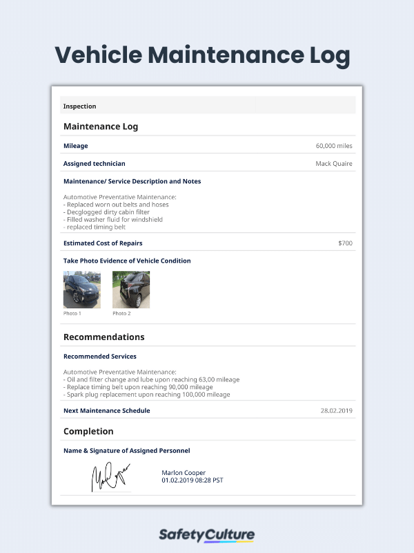 Facilitez la navigation dans les dossiers d’entretien des véhicules en indiquant les informations importantes concernant le véhicule, telles que la marque et le modèle, les informations relatives à l’assurance et le numéro d’identification du véhicule. Documentez les inspections, l’entretien et les réparations en détail en indiquant la personne qui les a effectués, la date d’achèvement et le nombre de kilomètres parcourus. Vous pouvez également prévoir des rappels tels que le contrôle des freins ou le remplacement des filtres à air. En cas d’accident, notez tous les dommages, le coût des réparations et des pièces de rechange.