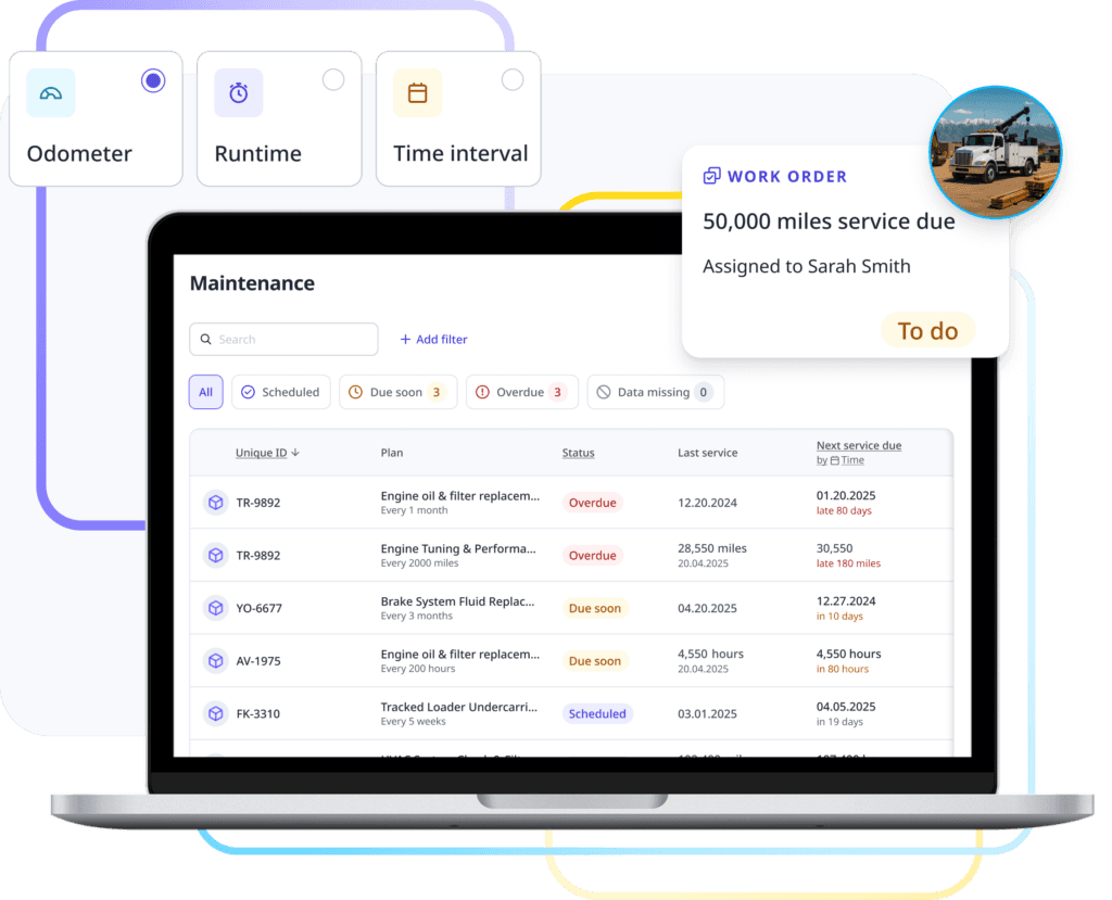 Custom maintenance plans: Set up automated maintenance for all of your assets based on time intervals, odometer or runtime.