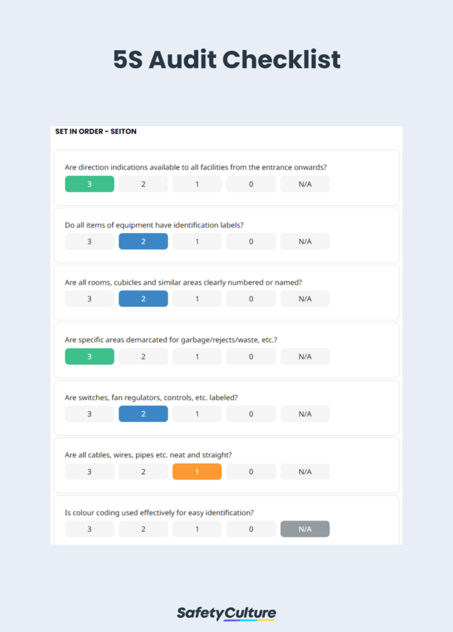 Uma lista de verificação de auditoria 5S é um sistema usado para avaliar a implementação do 5S no local de trabalho. Ela ajuda a garantir que o local de trabalho esteja seguindo os princípios do 5S: Seiri (Classificação), Seiton (Sistematização), Seiso (Brilho), Seiketsu (Padronização) e Shitsuke (Sustentação). A adoção do método 5S prevê 5 principais benefícios de longo prazo: