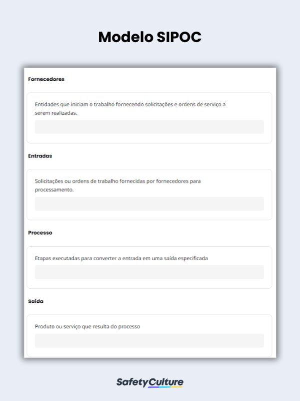 Um modelo SIPOC é usado por gerentes de processo ao criar um plano ou diagrama SIPOC. Ele contém 5 seções para cada aspecto, a saber, Fornecedor, Entrada, Processo, Saída e Cliente. Os modelos SIPOC ajudam os gerentes de processo a esboçar facilmente planos SIPOC para delinear processos de negócios internos ou externos.