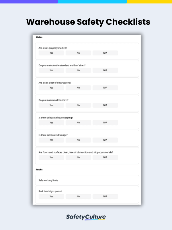 Uma lista de verificação de segurança para armazéns é usada por agentes de segurança e funcionários de um armazém para identificar riscos à segurança e propor medidas preventivas que evitem acidentes e ferimentos. Essa ferramenta é frequentemente adotada obrigatoriamente em armazéns para garantir que os trabalhadores tomem medidas de precaução dentro da instalação e, como consequência, protejam bens e vidas.