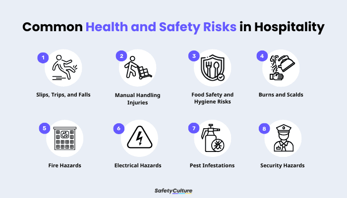 To better underscore the importance of health and safety in the hospitality industry, it is important to know the common risks, such as: