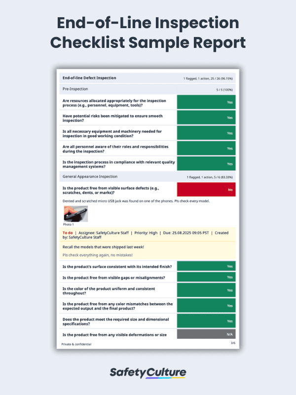 An End-of-Line (EOL) inspection checklist is the final quality control step of a production line that a finished product must go through. It’s a step-by-step tool used in manufacturing to ensure that finished goods meet all safety and quality standards before being shipped to customers. A digital checklist can help streamline this process through automated logs, scheduled maintenance, real-time monitoring, and employee training, catching quality issues early and helping prevent customer complaints.